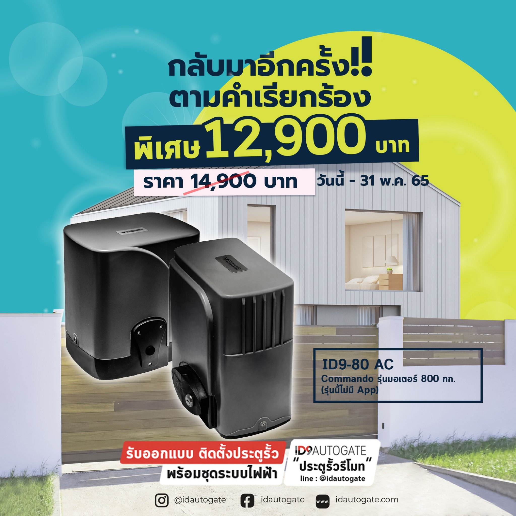 ชุดมอเตอร์สำหรับประตูรั้วแบบบานเลื่อน น้ำหนักประตูสูงสุดได้ประมาณ 800 กก. สำหรับรุ่น ID9-800 AC และ 600 กก. สำหรับรุ่น ID9-600 DC
